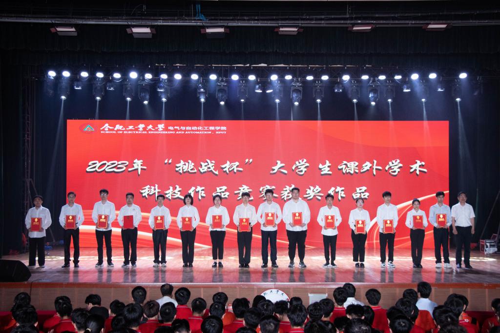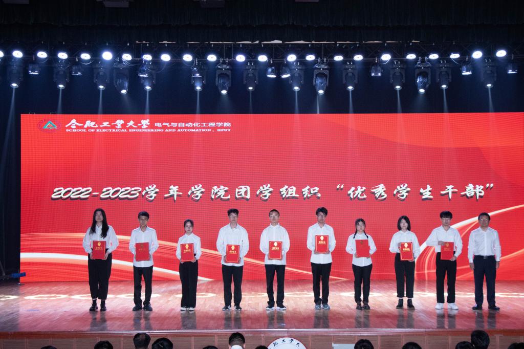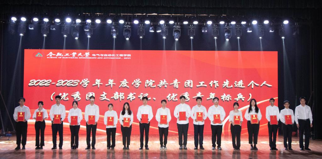 在颁奖仪式上,学院对2022-2023学年学院共青团工作先进个人、共青团工作先进集体、2022-2023学年团学组织“优秀学生干部”、合肥工业大学“三菱电机奖学金”获得者、合肥工业大学“特高压电网奖学金”获得者、2023年“挑战杯”大学生课外学术科技作品竞赛获奖作品进行了颁奖,向2022-2023学年“青春筑梦导师”进行了聘任。与会领导老师为获奖集体和个人代表以及导师团成员颁发了证书。