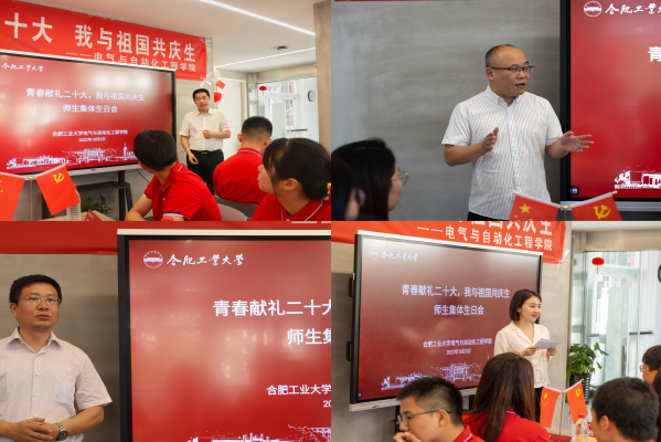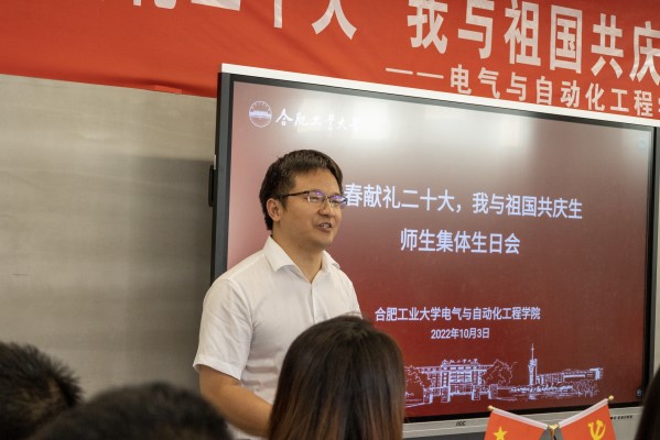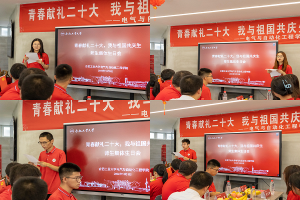 在学生代表谈成长成才环节,2022级本科生姚泽远同学谈到,与祖国同一天生日,让我感到无比荣幸与幸福,在今后的学习生活中,我将不负青春、不负韶华、勇挑重担、直面挑战,拒绝躺平,用自己的实际行动,为国家增光添彩,为母校增光添彩!2021级本科生陈建楠同学分享了自己对大学这一年来的总结,要抓住学习中心任务不放松,学会做人,学会做事,努力成为一名德智体美劳全面发展的新时代有为青年大学生。2020级本科生许荣萍同学讲到国庆佳节恰逢我们合肥工业大学的校庆,工大秉承着“厚德、笃学、崇实、尚新”的校训,教育了一代代莘莘学子,培育出大批德才兼备的优秀人才。在知识改变命运的今天,希望自己能够珍惜美好的大学时光,热爱生活,努力拼搏,将自己的成才发展梦融入国家和社会的建设发展梦。2019级本科生钟璐瑶同学回忆了大学四年的奋斗时光,希望学弟学妹们努力拼搏、自律自信、和善知礼,在青春时光里努力创造属于自己的无限价值,做更好的自己,勇担属于我们这一代青年大学生的使命担当。