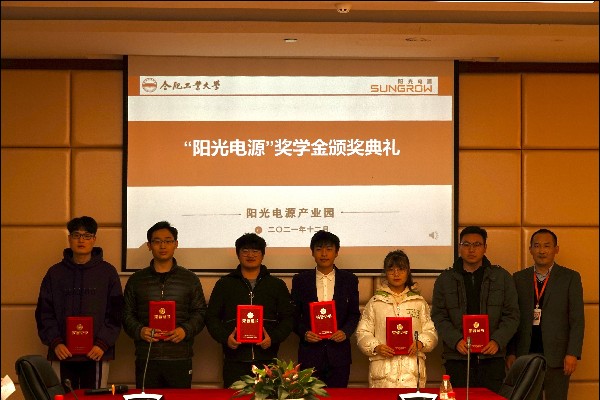 之后,郑洁宣读第九届“阳光电源”奖学金表彰决定,双方负责人为获得“阳光电源”奖学金的同学颁奖,学生代表2018级本科生王庆龙进行获奖发言。