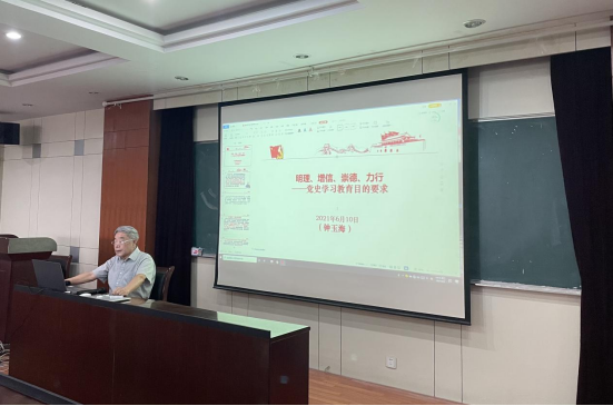 邀请钟玉海教授在逸夫楼1117室为学院全体教工党员作党史学习教育专题辅导报告,题为明理、增信、崇德、力行——党史学习教育目的要求。学院党委书记何岳颀主持报告会。