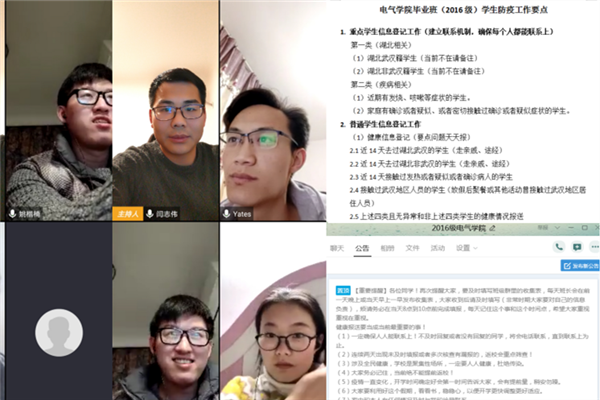 各年级辅导员结合目前疫情的发展形势,系统地传达了教育部、团中央等上级部门的通知要求,重点传达了学校自疫情防控以来发布的关于延迟开学、健康日报、线上心理辅导、网络资源开放、选课选教等工作要求。同时结合各年级学生特点,分别有针对性的向学生开展了就业、心理、责任、学习、安全等主题教育。