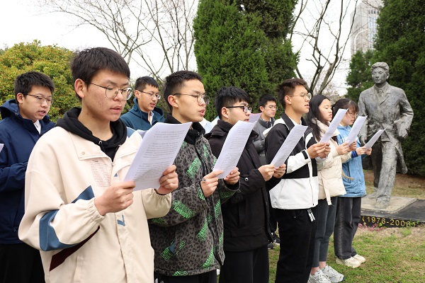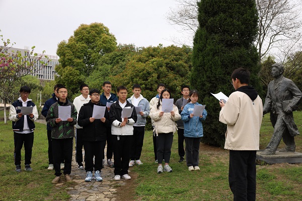 于翡翠湖校区陈秋华烈士雕塑前开展“缅怀英烈砺斗志,传承工业报国情”诵读学传主题实践,“晨”遇经典思政早点坊学员参加活动。
