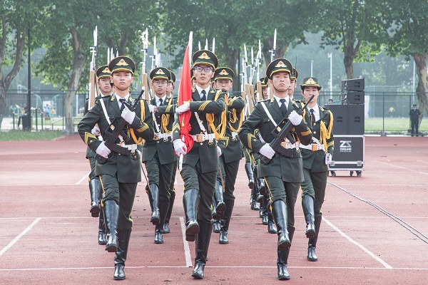 7时15分许,升旗仪式正式开始,国旗护卫队队员昂首挺胸,迈着整齐的步伐,护卫国旗,走向升旗台。在雄壮的国歌声中,在师生们注目凝视中,冉冉升起鲜艳的五星红旗,全体师生向国旗行注目礼,齐唱国歌。