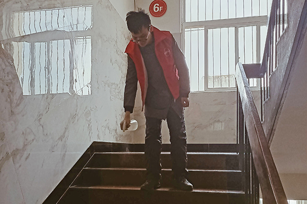在活动开始后,志愿者们以极大的热情投入活动当中。他们在自己相应的楼层认真的进行消毒活动,在卫生工具及垃圾收理处进行多次消毒处理,绝不放过任何死角。在此次活动中,志愿者合理分工,不怕累,以实际行动诠释了“志愿”服务精神,展现了良好的风貌。