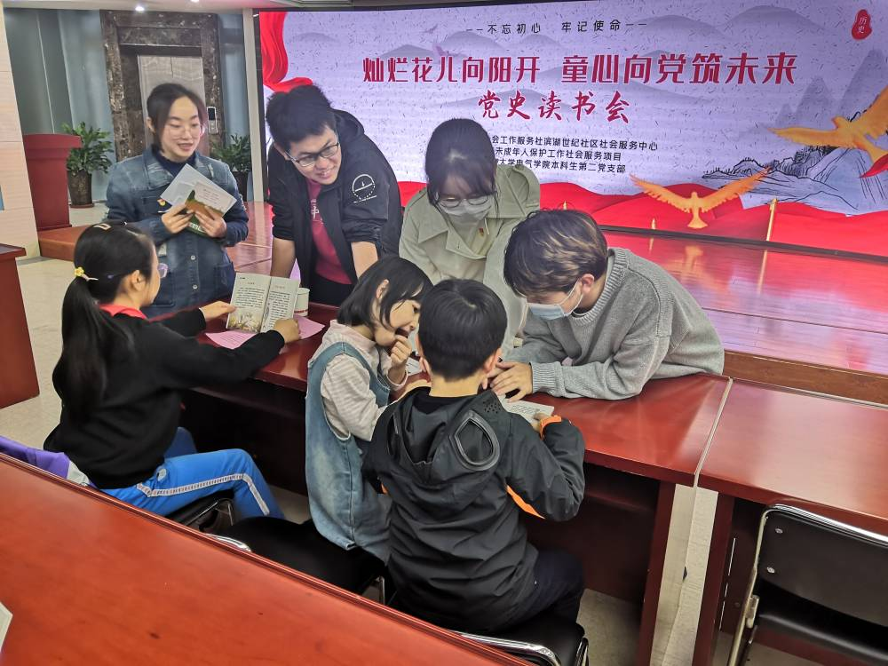 本科生第二党支部赴滨湖世纪社区服务中心开展“灿烂花儿向阳开,童心向党筑未来”读书会主题党日活动,以学党史,悟思想为核心,与小朋友们一道学习党的历史故事。