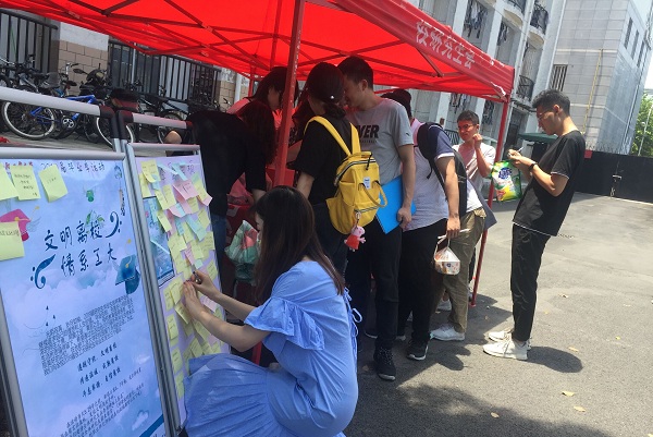 活动中,工作人员向毕业生们发放文明离校资料,传达文明离校概念,倡导同学们离校之际维护宿舍和校园环境,营造良好学习氛围。新禧公寓活动地点过往的同学表现出极大兴趣,踊跃参与、纷纷在告别横幅上签名以表达对倡议的支持。