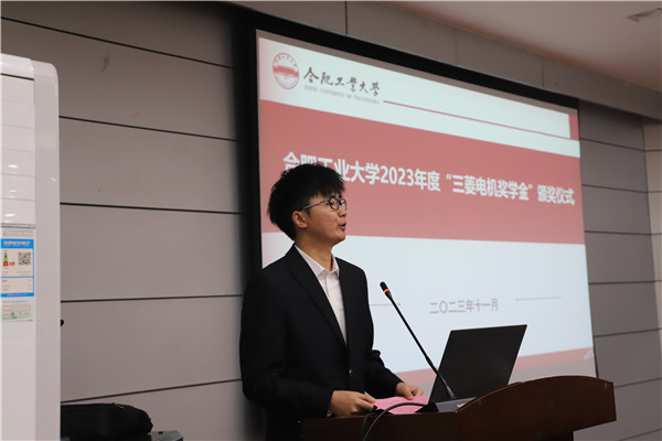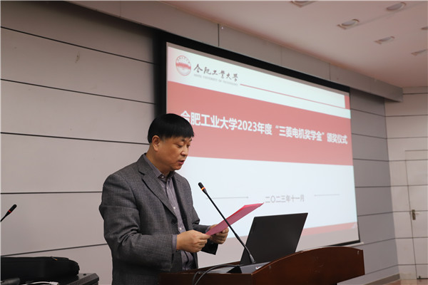 电气工程系教授张兴宣读了《关于表彰合肥工业大学第十四届“三菱电机奖学金”获得者的决定》,并对获奖学生表示诚挚的祝贺。