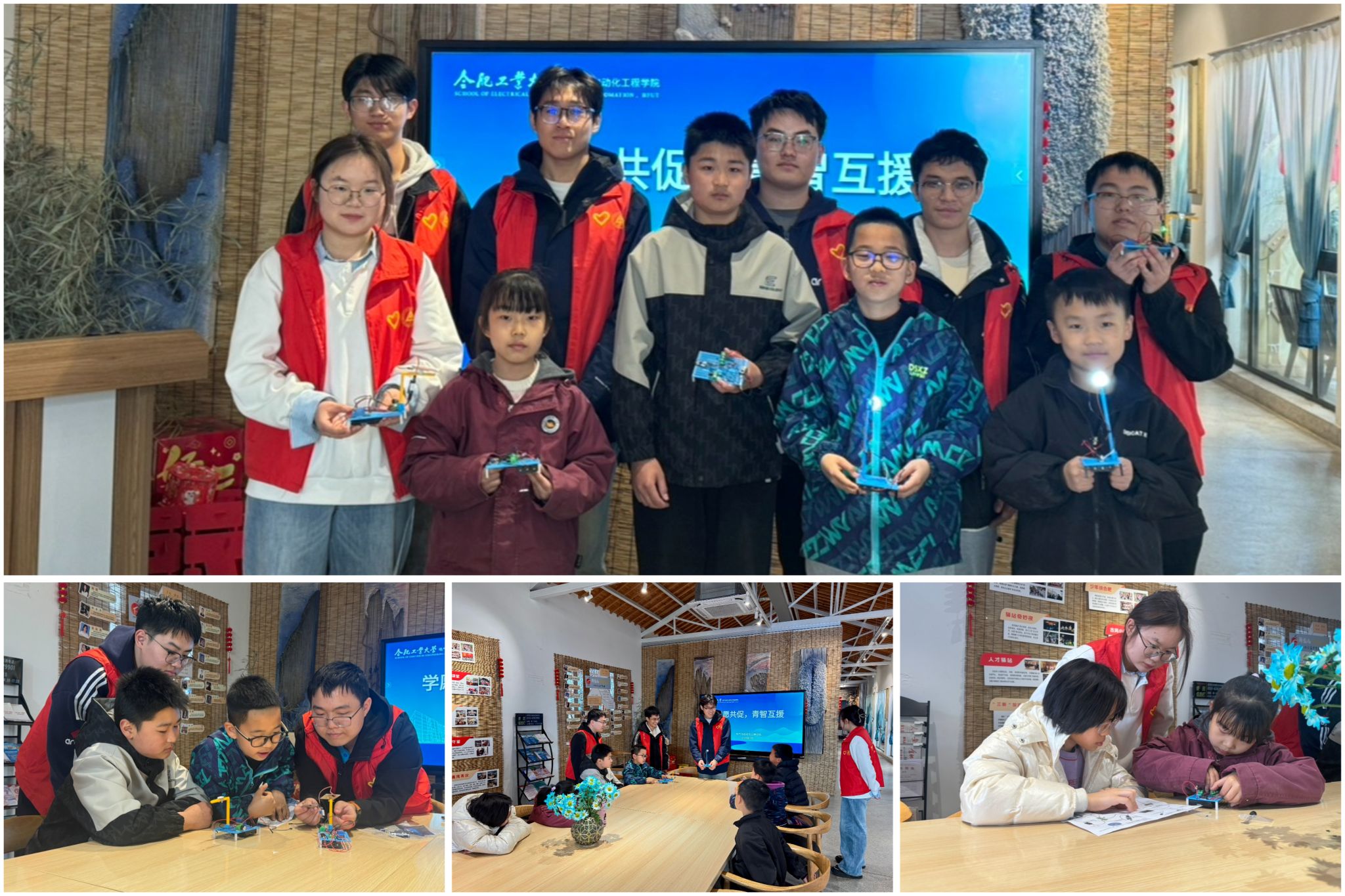 智启萌芽,知识播种。依托科普图文和真实案例,学生骨干将专业知识巧妙融入趣味互动中,向小朋友介绍了机器人的基本知识与多样分类,搭建对机器人的认识。一边现场演示声光控感应灯、下雨报警器、火灾报警器的工作过程,一边结合夜晚楼道照明、天气监测、火灾预警等生活场景,讲解出模型背后的科学原理,让小朋友直观感受到科技在日常生活中的重要应用。小朋友们踊跃提问,同学们耐心解答,在轻松愉悦的互动氛围中加深了小朋友对机器人知识的理解,更在他们心间播下热爱科学、探索科技的种子。