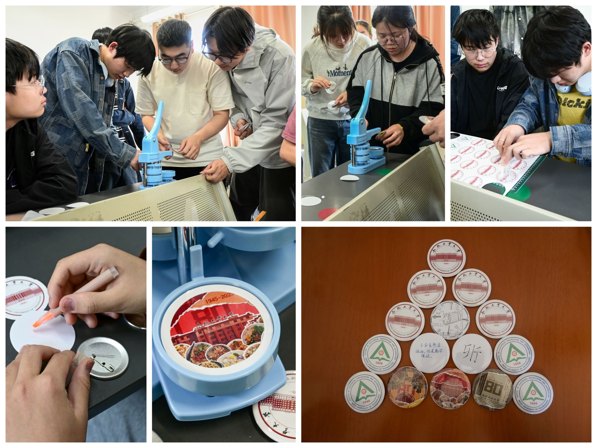 活动围绕工大元素解构、院徽创新和主题海报创作展开。同学们运用平面编辑技术,将自制校庆主题海报与校徽、院徽进行结合,随后实际操作,通过裁切、塑膜、加压进行徽章制作,将工大特色美食印记、斛兵塘畔美丽风景、校史文化精神内核等校园元素相融合,设计出“吃在工大”“景在工大”“情在工大”系列主题徽章,用学习生活中的工大“微事物”诠释同学们对爱校荣校精神的深刻理解。