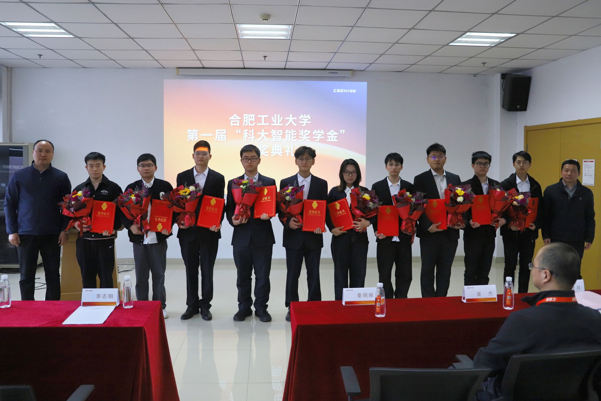 李志明向科大智能科技股份有限公司长期以来对学校的支持表示衷心感谢,并对获奖学生表示祝贺。他希望获奖学生带着回报企业、回报社会的社会责任感,带着发奋图强的事业心全面发展、有所作为。秦明辉对我校师生的到来表示热烈欢迎,向获奖学生表示祝贺。他希望通过奖学金的设立激励更多优秀学子投身电气领域的学习与研究,为未来行业的可持续发展贡献智慧和力量。施大顺宣读表彰决定。与会领导老师为27名获奖学生颁奖。