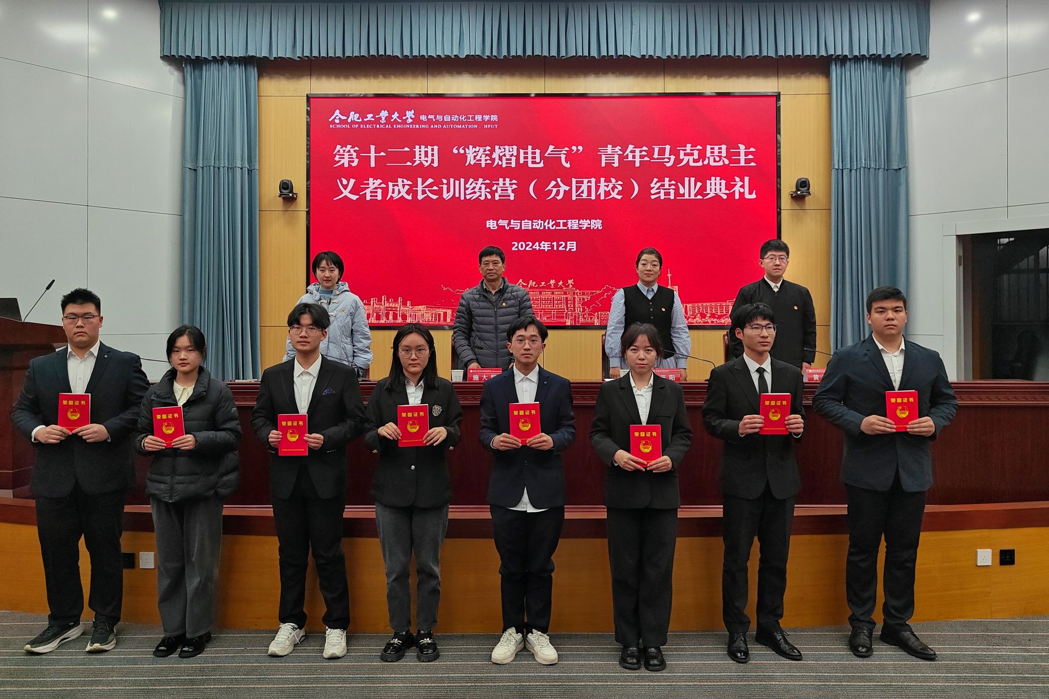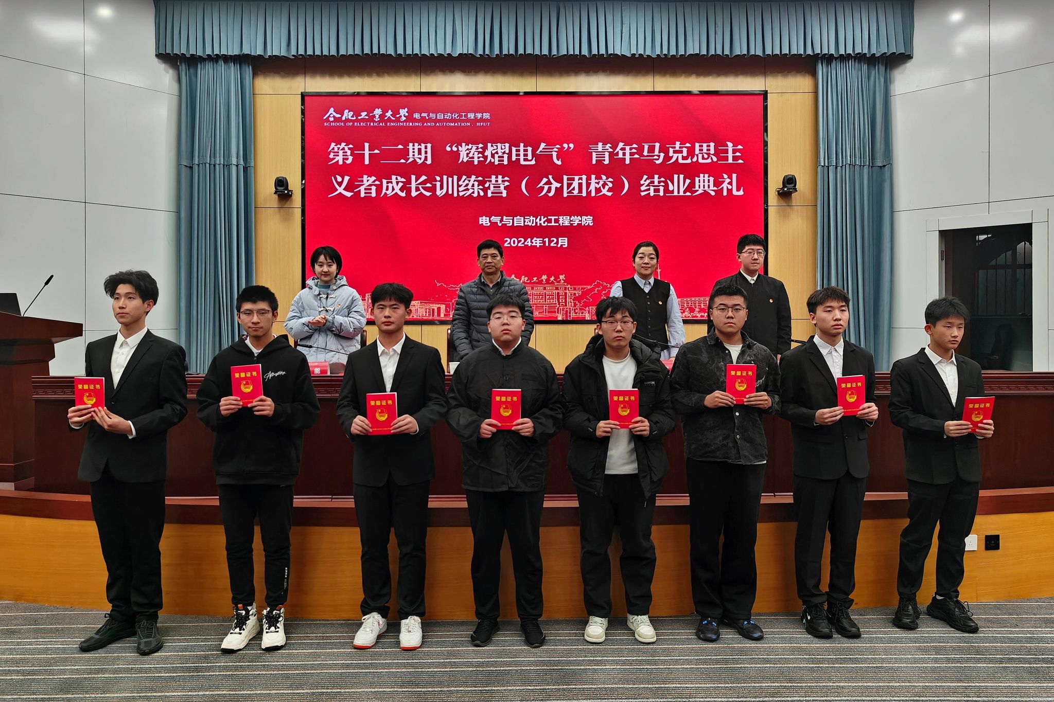 第十二期“辉熠电气”青年马克思主义者成长训练营(分团校)优秀学员表彰的决定》。本期训练营共计80名学员顺利结业,张育硕等16名同学获评“优秀学员”荣誉称号,与会领导老师为优秀学员颁奖并合影留念。2024级电气工程及其自动化专业腾赫同学作为学员代表发言,分享了团校培训中的收获与感悟,表达了在实现中华民族伟大复兴征程中书写青春华章的决心。施大顺在总结中肯定了本期分团校培训取得的效果,勉励全体学员继续加强学习,以科学理论武装自身,保持优良品格,以使命担当感召自身,树立理想信念,以坚定信仰鼓舞自身,用实际行动践行青年学子责任,勇担时代赋予青年的使命。