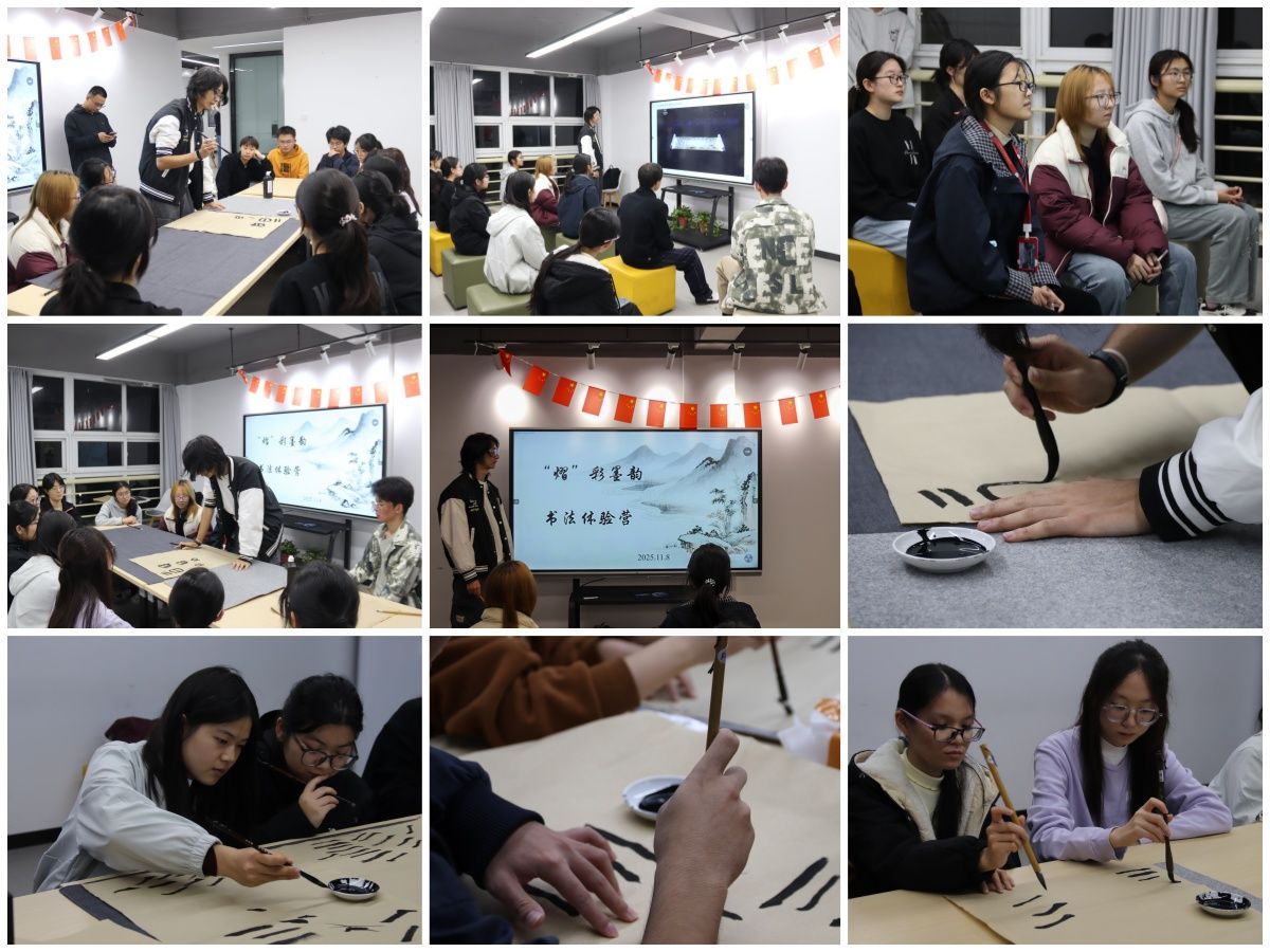 体验营于2025年11月开始,分三期进行。指导老师首先从汉字演变的趣味故事切入,结合《兰亭序》等经典碑帖,细致解读笔墨间的章法韵味与文人墨客的家国情怀。随后,老师示范运笔的轻重缓急,手把手调整学生握笔姿势,“横要平稳如桥,竖要挺拔如松”,将不怕牺牲、英勇斗争的革命精神巧妙融入书写指导。在墨香氤氲的学生社区,同学们凝神静气、反复练习,将建党精神、延安精神等红色基因融入笔墨传承,在“永字八法”和汉字的形意之美中体会中华文明的连续性。