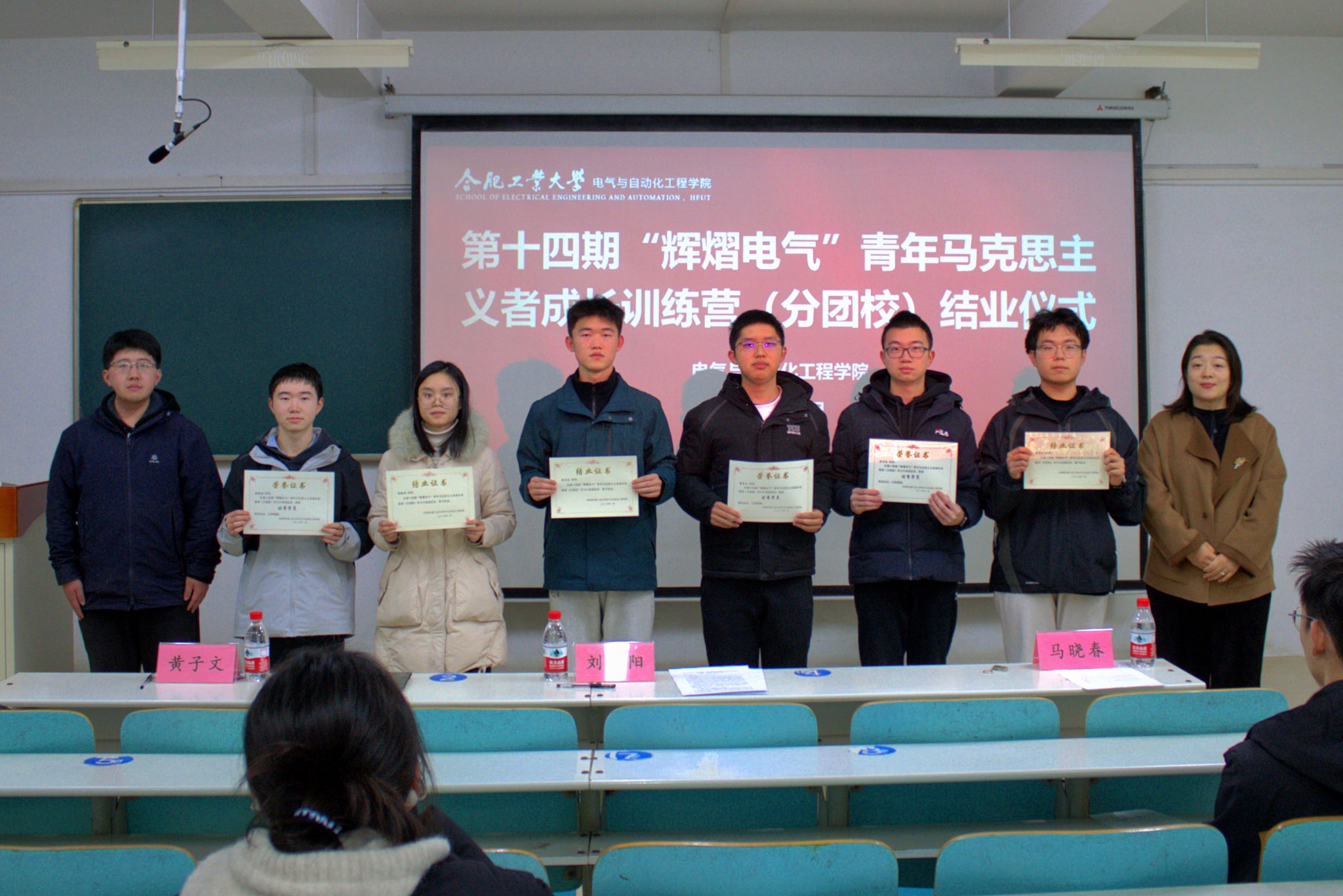 第十四期“辉熠电气”青年马克思主义者成长训练营(分团校)结业典礼在翡翠湖校区教学楼翠603举行。学院团委书记兼研究生辅导员刘开阳、2022级本科辅导员黄子文、分团校班主任与全体学员参与仪式。