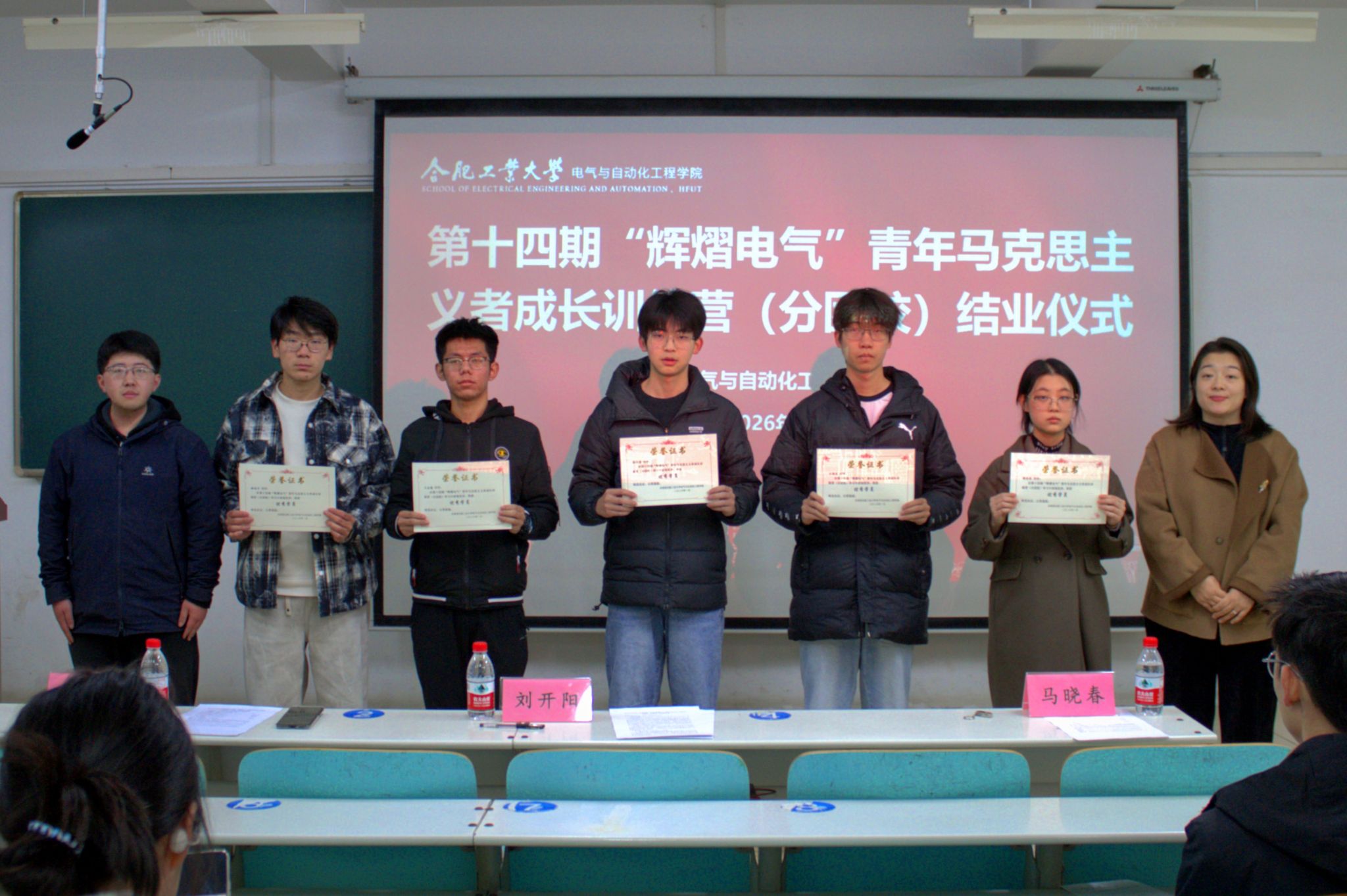 第十四期“辉熠电气”青年马克思主义者成长训练营(分团校)学员结业与优秀学员表彰的决定》。2025级电气工程及其自动化专业韩佳彤同学作为学员代表发言。本期训练营共计61名学员顺利结业,胡浩轩等12名同学获评“优秀学员”荣誉称号,与会领导老师为优秀学员颁奖并合影留念。