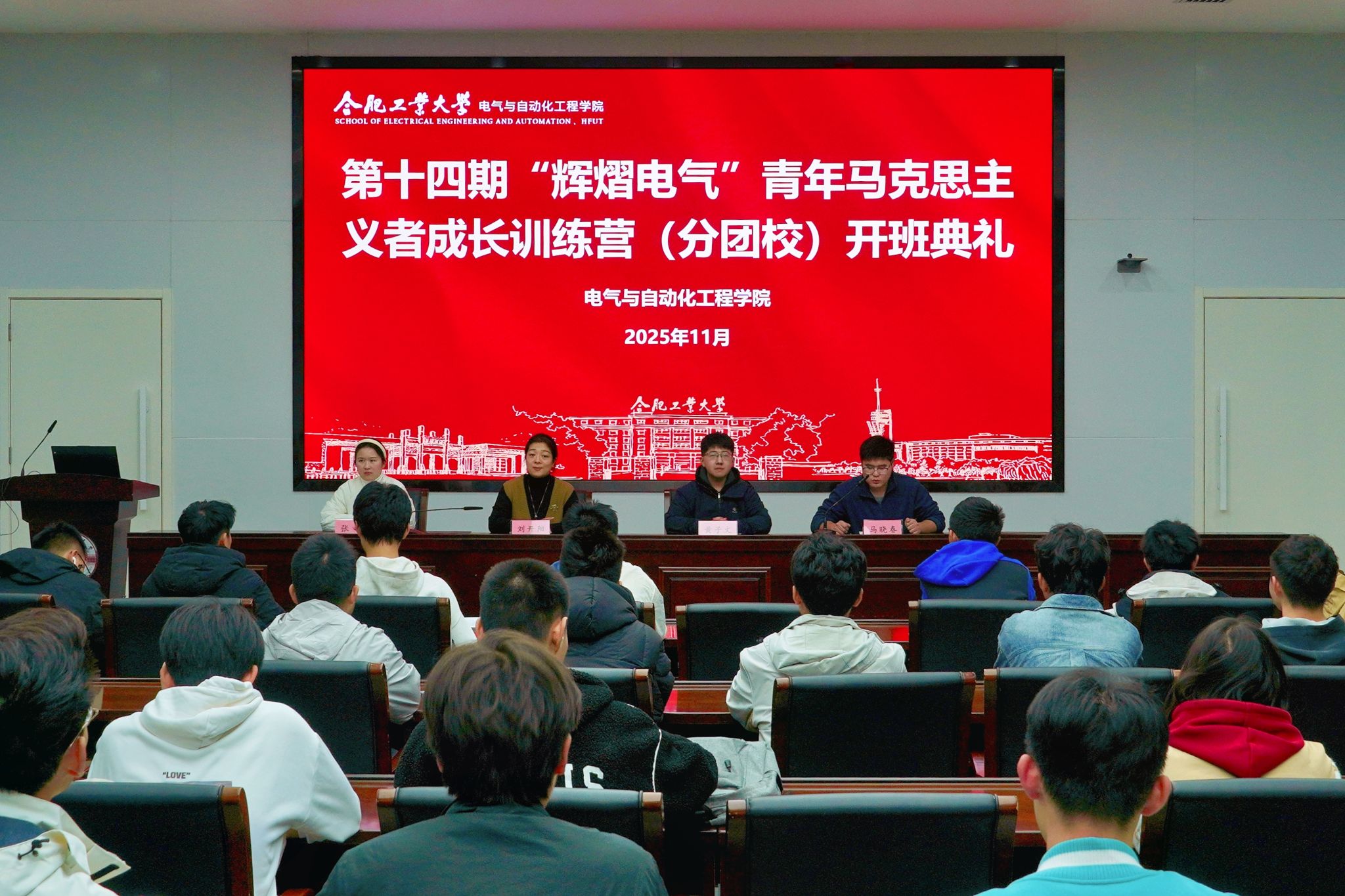 第十四期“辉熠电气”青年马克思主义者成长训练营(分团校)开班仪式在屯溪路校区学术会议中心三楼报告厅举行,学院团委、学工办相关辅导员老师、团校负责老师与参训学员参加仪式。