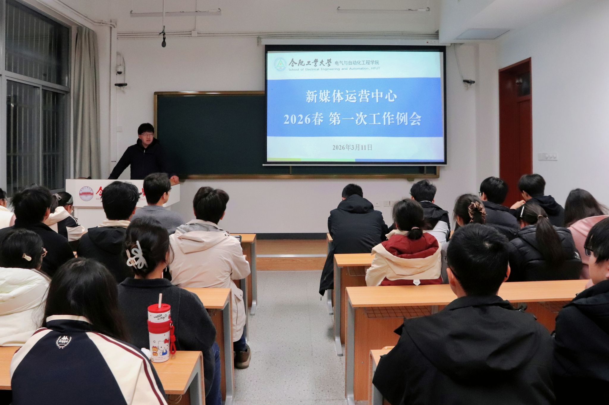 于翡翠湖校区六教103教室召开2026年新媒体工作计划研讨会,学院相关负责教师、“熠熠生辉”网络文化工作室全体成员、新媒体运营中心往届代表参加。