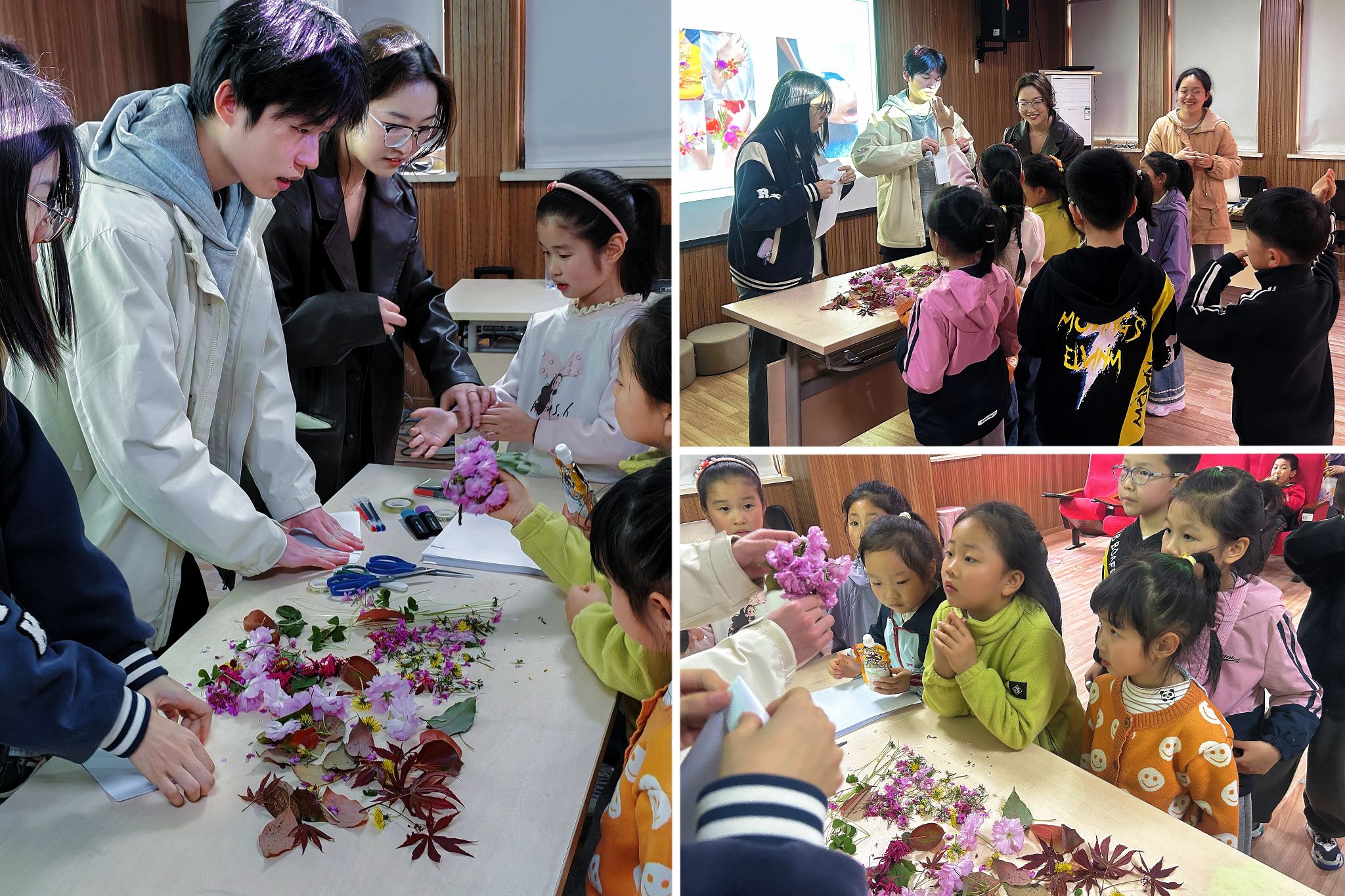 活动现场,大学生党员面向社区青少年开展“踏春而行”科普宣讲,介绍了春季常见花卉植物的科属特征,并穿插环境科普知识,通过趣味问答等形式,鼓励小朋友们争当“环保小卫士”。实践环节中,志愿者对工大校园内收集的落叶花瓣进行实物展示,利用简易工具制作植物手环,引导孩子们深化对生态文明的理解,观察植物之美,提升动手能力与创意思维,将热爱自然、热爱生活的种子播撒心间 。